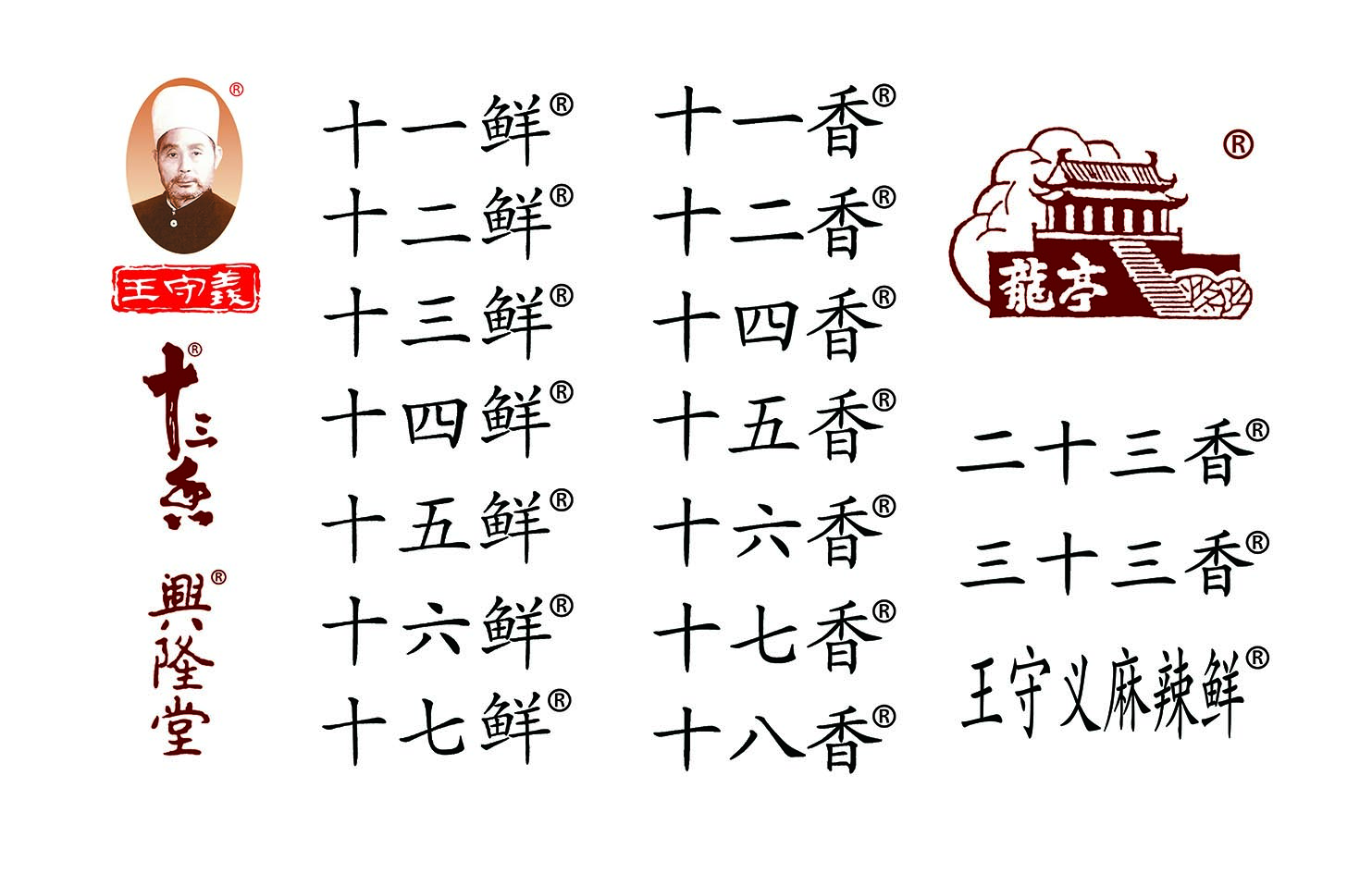 公司一直注重商标品牌战略,分别于1997年、1999年向国家商标局申请了“王守义”、“十三香”两商标并且获得注册证。除此之外公司实行多品牌战略,除“王守义”、“十三香”品牌以外,旗下还拥有还有“十一香、十二香、十四香、十五香、十六香、十七香、十八香、二十三香、三十三香、十一鲜、十二鲜、十三鲜、十四鲜、十五鲜、十六鲜、十七鲜、王守义麻辣鲜、龙亭、兴隆堂”等多种品牌,满足不同的市场需求。目前,各品牌已经呈现百花齐放的态势。